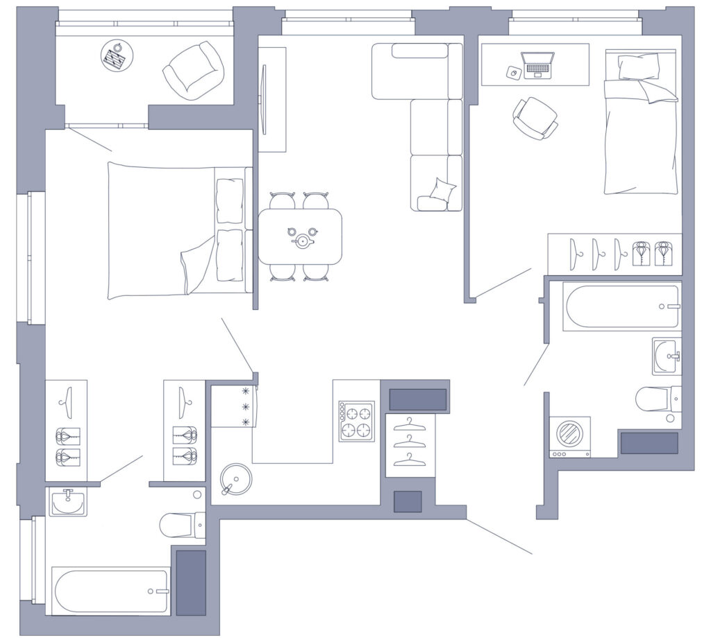 Просторная и светлая планировка с анфиладной-спальней, которая включает дополнительный санузел в ванной комнате и обширную гардеробную идеально подойдёт для семьи с одним или двумя детьми. В родительской ванной комнате предусмотрено окно, что сделает пространство еще более светлым. В квартире также удобно и то, что детская и родительская комнаты расположены в противоположных сторонах квартиры. Так каждый получает больше личного пространства.